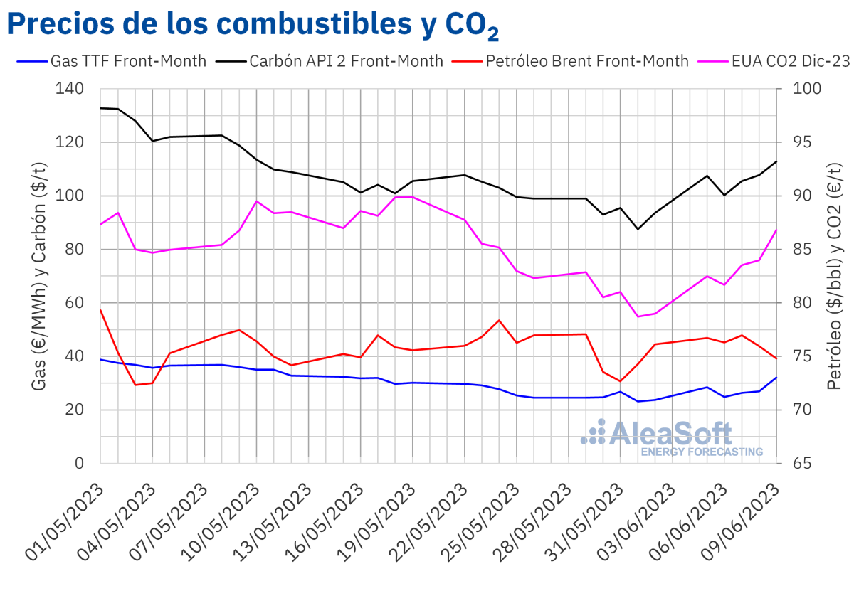 Por lo que respecta a los precios de cierre de los futuros de derechos de emisión de CO~2~ en el mercado EEX para el contrato de referencia de diciembre de 2023, durante la segunda semana de junio, registraron incrementos casi todos los días. La excepción fue el martes 6 de junio, cuando tras un descenso del 1,0% respecto al lunes, se registró el precio de cierre mínimo semanal, de 81,66 €/t. Este precio todavía fue un 1,4% mayor al del martes anterior. Por otra parte, como resultado de los incrementos de precios registrados, el viernes 9 de junio se alcanzó el precio de cierre máximo semanal, de 86,79 €/t, el cual fue un 9,9% mayor al del viernes anterior.