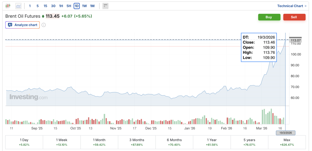El crudo Brent, de referencia en el mercado europeo ha despertado este jueves con un precio de 113 dólares tras el contraataque de Irán a infraestructuras energéticas de aliados de EEUU en el Golfo Pérsico.