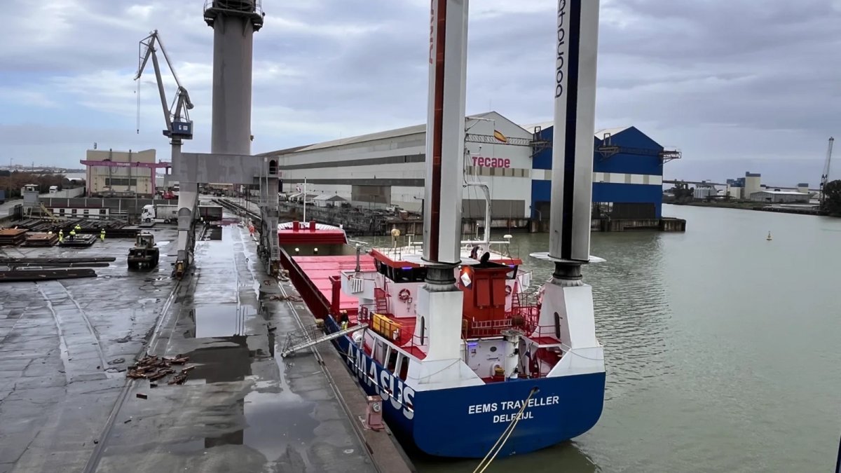 El Puerto de Sevilla ha recibido un innovador buque, el 'Eems Traveller', que usa la propulsión eólica para una navegación marítima más sostenible, y en la terminal portuaria va a descargar planchas de acero que la compañía Tecade utilizará para la fabricación de una nueva plataforma energética.