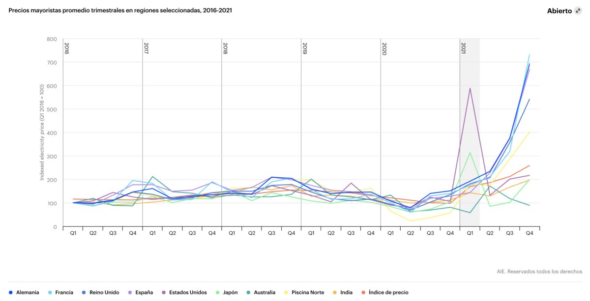 El índice de precios de la AIE para los principales mercados mayoristas de electricidad casi se duplicó en comparación con 2020 y aumentó un 64 % con respecto al promedio de 2016-2020. En Europa , los precios promedio de la electricidad al por mayor en el cuarto trimestre de 2021 fueron más de cuatro veces superiores al promedio de 2015-2020. Además de Europa, también hubo fuertes aumentos de precios en Japón e India, mientras que fueron más moderados en Estados Unidos, donde los suministros de gas se vieron menos perturbados.