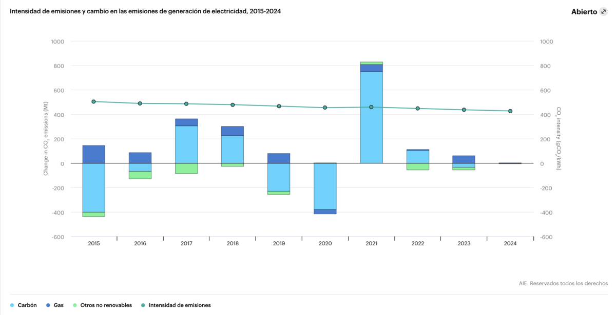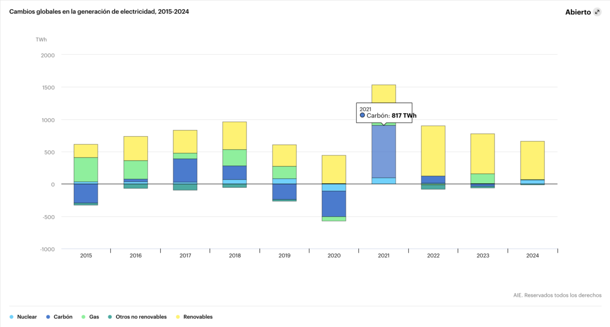 La electricidad producida a partir de fuentes renovables creció un 6 % en 2021, pero no fue suficiente para satisfacer la demanda galopante. La generación a carbón creció un 9 %, sirviendo a más de la mitad del aumento de la demanda y alcanzando un nuevo pico histórico a medida que los altos precios del gas natural llevaron al cambio de gas a carbón. La generación a gas creció un 2%, mientras que la nuclear aumentó un 3,5%, casi alcanzando sus niveles de 2019. En total, las emisiones de dióxido de carbono (CO2) derivadas de la generación eléctrica aumentaron un 7%, alcanzando también un máximo histórico, tras haber disminuido los dos años anteriores.