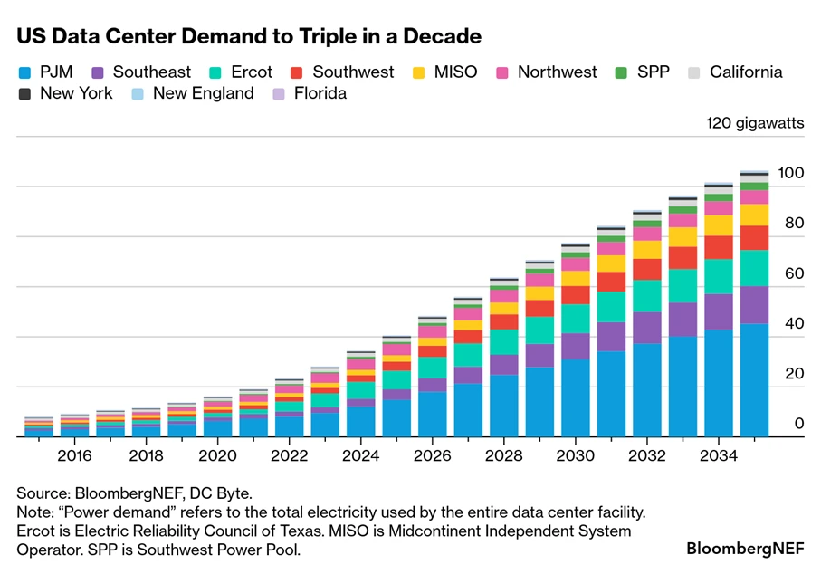 Tras décadas de una demanda eléctrica relativamente estable, Estados Unidos está entrando en una era de rápido crecimiento del consumo. Según BloombergNEF, el auge de los centros de datos impulsados por IA, los vehículos eléctricos y la generación y el almacenamiento distribuidos está transformando el perfil de consumo del país a una velocidad sin precedentes. Los veranos más calurosos impulsan un mayor uso del aire acondicionado, mientras que las primeras etapas de la electrificación industrial están sometiendo a una presión adicional a una red eléctrica ya de por sí sobrecargada.