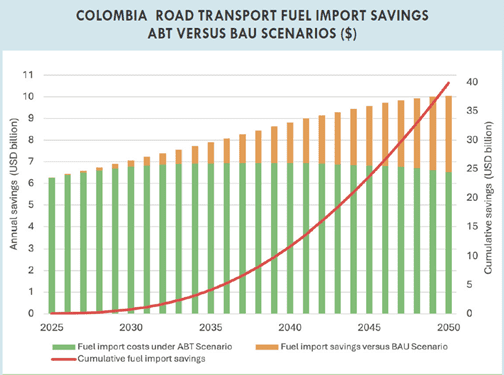 De forma acumulada, una transición acelerada a los BEV en Colombia permitiría ahorrar US$40.000 millones en importaciones de combustibles fósiles de aquí a 2050.