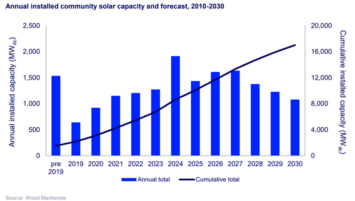 A finales de 2025, las instalaciones acumuladas de energía solar comunitaria alcanzaban los 10,1 GWdc. Wood Mackenzie ha desarrollado escenarios alto y bajo para reflejar la incertidumbre del mercado: