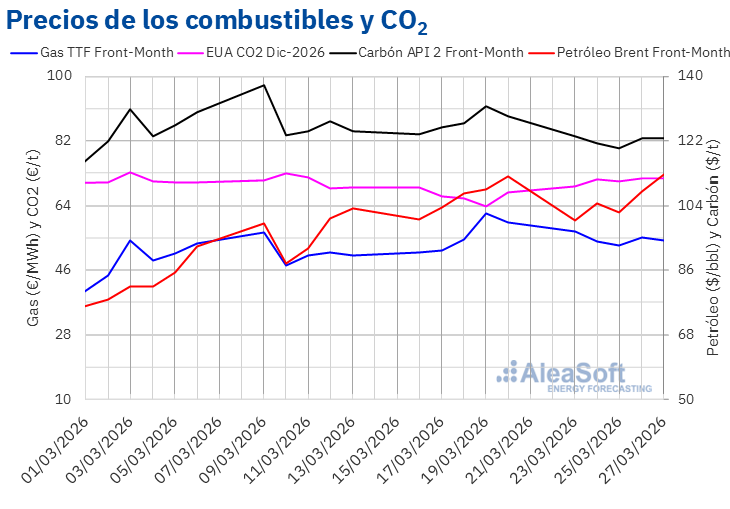 Por lo que respecta a los precios de cierre de los futuros de derechos de emisión de CO2 en el mercado EEX para el contrato de referencia de diciembre de 2026, registraron una tendencia mayoritariamente ascendente durante la cuarta semana de marzo. El lunes 23 de marzo, estos futuros registraron su precio de cierre mínimo semanal, de 69,26 €/t, mientras que el resto la semana los precios de cierre superaron los 70 €/t. El viernes 27 de marzo, estos futuros alcanzaron su precio de cierre máximo semanal, de 71,69 €/t. Según los datos analizados en AleaSoft Energy Forecasting, este precio fue un 5,9% mayor al del viernes anterior.