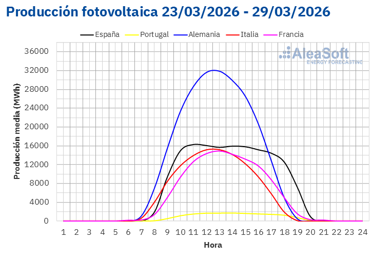 Durante la semana del 30 de marzo, según las previsiones de producción solar de AleaSoft Energy Forecasting, la tendencia positiva continuará en los mercados italiano y español. Sin embargo, en el mercado alemán la producción fotovoltaica disminuirá.