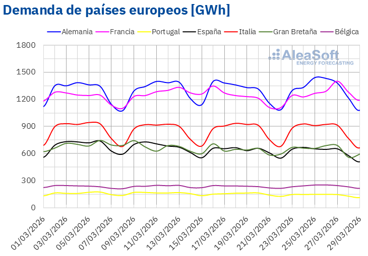 En la semana del 30 de marzo, según las previsiones de demanda de AleaSoft Energy Forecasting, la tendencia positiva se revertirá y la demanda disminuirá en los principales mercados europeos.