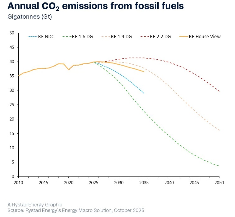 De cara al futuro, Rystad delinea cinco trayectorias que moldearán el panorama energético mundial, que incluyen los escenarios Rystad Energy NDC, 1,6 °C, 1,9 °C, 2,2 °C, y Rystad Energy House View.
