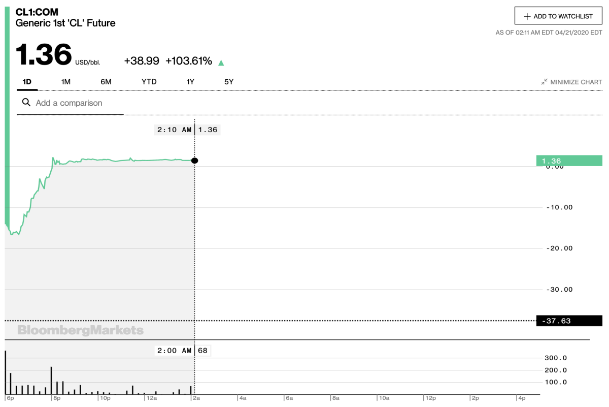 Los precios negativos en el petróleo han durado poco. El barril de West Texas ya está cotizando en positivo en el mercado de preapertura y se espera que inicie su cotización en los 1,36 dólares por barril en el que será el último día de cotización del crudo que se entrega para el próximo mes de mayo.