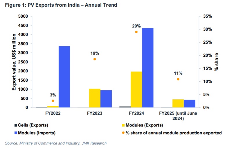 India está haciendo progresos significativos en la transición de un importador neto a un exportador neto de productos solares fotovoltaicos (FV), con el valor de las exportaciones aumentando 23 veces a 2.000 millones de dólares en el año fiscal 2024 desde el 2022, afirma un nuevo informe del Instituto de Economía Energética y Análisis Financiero (IEEFA) y JMK Research & Analytics.