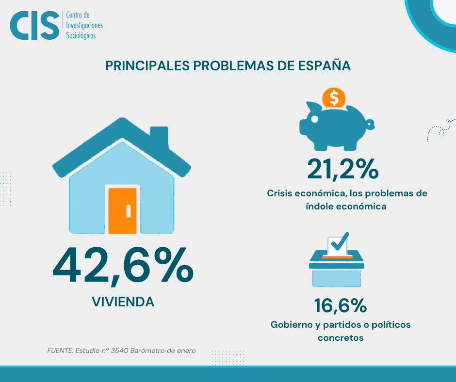 Llevamos meses si no años escuchando que el principal problema para los españoles es la vivienda. Según el Centro de Investigaciones Sociológicas (CIS), este problema no para de incrementarse. En el último barómetro del pasado mes de enero, para el 42,6% de los encuestados, el principal problema en España es la vivienda.