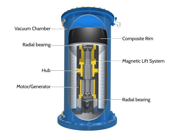 Los volantes de inercia son tubos de fibra de carbono avanzados hasta 3 metros de alto y 1 metro de ancho que están flotando en los imanes dentro de un vacío, y se mantiene la electricidad en un entorno sin fricción, hasta que se necesita la energía de nuevo en el sistema.