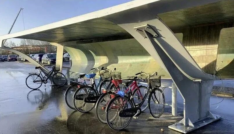 Un ejemplo representativo de esta solución lo encontramos en el puerto de Aalborg (Dinamarca), donde un segmento de pala ha sido reutilizado como aparcamiento cubierto para bicicletas.