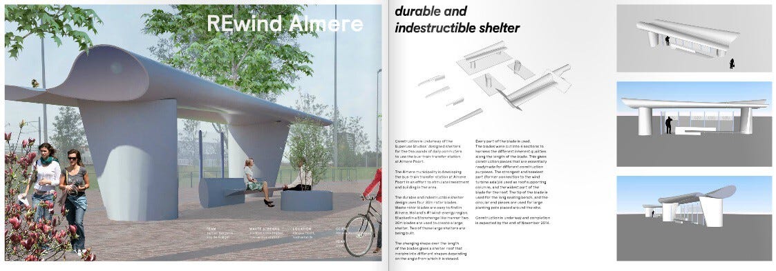 También en Rotterdam, concretamente en la céntrica plaza Willemsplein, varias palas de aerogenerador han sido reutilizadas como parte del mobiliario urbano, dando lugar a una intervención funcional y con fuerte carga simbólica.