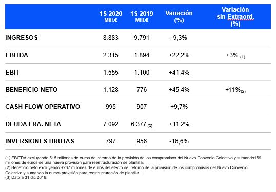 Estos resultados recogen el impacto de la entrada en vigor del nuevo Convenio Colectivo y el registro de determinadas provisiones por reestructuración de plantilla, que han generado un impacto positivo neto de 267 millones de euros. Excluyendo este impacto extraordinario, el incremento en el resultado neto es aún del 11%, lo que demuestra la fortaleza de las cuentas de la compañía a pesar del escenario actual.