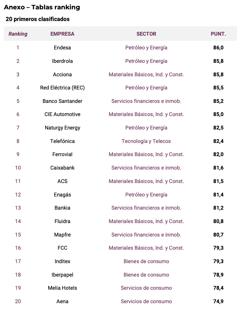 Todas las empresas presentes en el top diez pertenecen al Ibex 35, con mayoría de compañías del sector energético (Endesa, Iberdrola, Red Eléctrica y Naturgy), seguidas del sector construcción (Acciona y Ferrovial) y financiero (Santander y Caixabank), además de una empresa del sector metal (CIE Automotive) y una de telecomunicaciones (Telefónica).