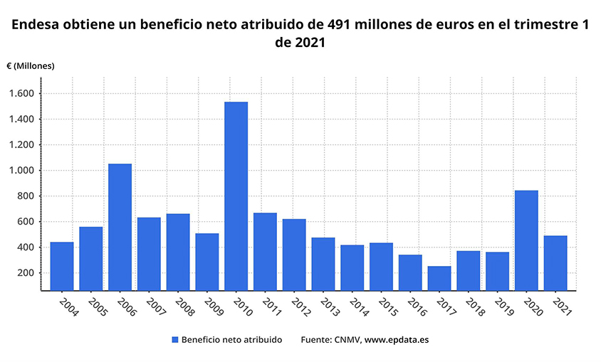 Endesa obtuvo un beneficio neto de 491 millones de euros en el primer trimestre del año, lo que representa una caída del 41,8% con respecto al mismo periodo del ejercicio anterior, aunque ha ratificado sus objetivos para el conjunto de 2021.
