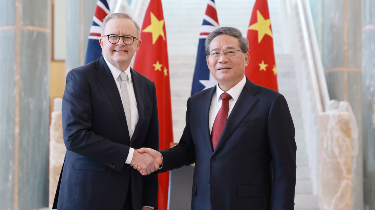 El 'premier' chino Li Qiang (derecha), estrecha la mano del primer ministro australiano, Anthony Albanese, durante la Reunión Anual de Líderes China-Australia, celebrada en Canberra, Australia, el 17 de junio de 2024. Imagen: Xinhua