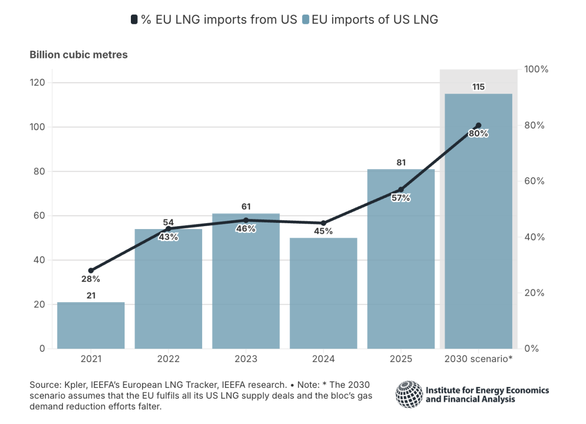 Análisis de IEEFA proyectan que, si se materializan todos los contratos a largo plazo, para 2030 hasta el 80% de las importaciones europeas de GNL y el 40% de todo el gas importado podrían proceder de EEUU. Esto contradice frontalmente la estrategia REPowerEU, basada en la diversificación y la reducción de la demanda, y encierra a Europa en una dependencia costosa con un socio cuyo compromiso político puede ser volátil.