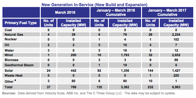 El gas natural, que ha dominado los nuevos proyectos en lo que va de siglo, apenas registró actividad en ñlo que va de año. Las seis nuevas unidades puestas en línea en los primeros tres meses de 2018 sumaron solo 79 MW-AC, en comparación con las 28 unidades que representan 2,25 GW en el primer trimestre de 2017.
