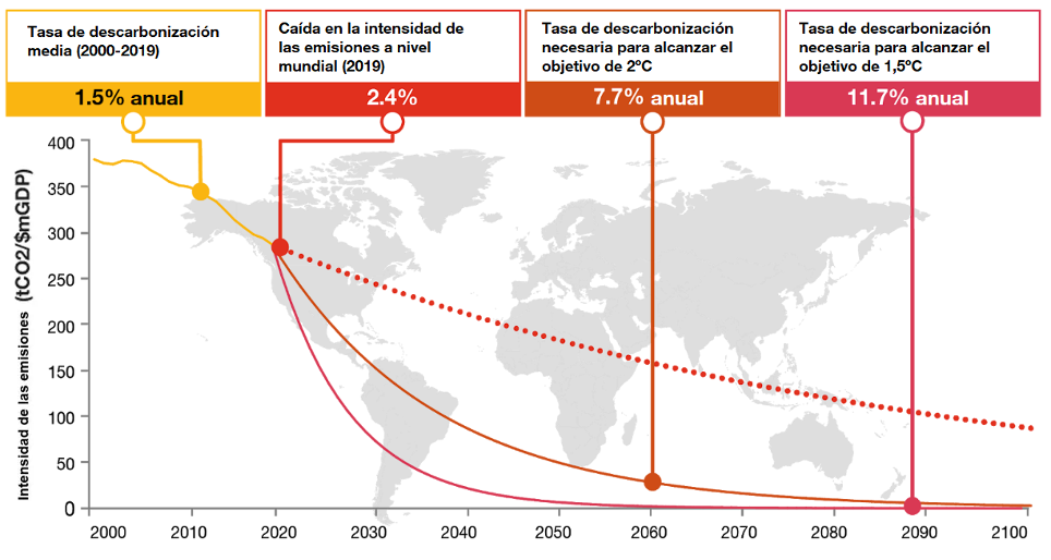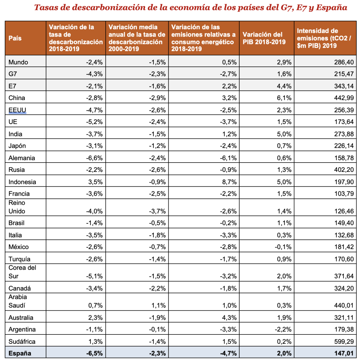 En 2019, España disminuyó la intensidad de sus emisiones de carbono un 6,5%, claramente por encima del 4,1% del año anterior. Esto nos convierte en el segundo país que más las redujo en relación con los integrantes del G20, solo por detrás de Alemania -que consiguió reducirlas un 6,6%-, y muy por delante de la media mundial, que se quedó en un 2,4%. A pesar de los progresos, los objetivos del Acuerdo de París siguen alejándose: para poder limitar el calentamiento a 1,5ºC, la tasa de descarbonización a nivel mundial tendría que crecer hasta un 11,7%, es decir casi cinco veces más de los niveles actuales.