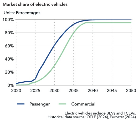 Según el informe, la producción eléctrica avanza con más fuerza: las emisiones cayeron a 36 MtCO₂ en 2023 y caerán a solo 2 MtCO₂ en 2050 gracias al auge de la solar y la eólica. Sin embargo, la saturación de la red, los bajos precios solares diurnos y el reciente apagón eléctrico ponen en evidencia la necesidad de más inversión en redes, almacenamiento y estabilidad del sistema.