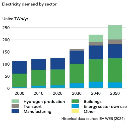 El informe alerta de que el consumo eléctrico no crece desde 2003, lo que compromete la electrificación masiva necesaria para descarbonizar industria, edificios y transporte. La industria migrará progresivamente del gas y del petróleo hacia la electricidad y el hidrógeno, mientras que en los hogares la sustitución de calderas fósiles por bombas de calor será esencial.