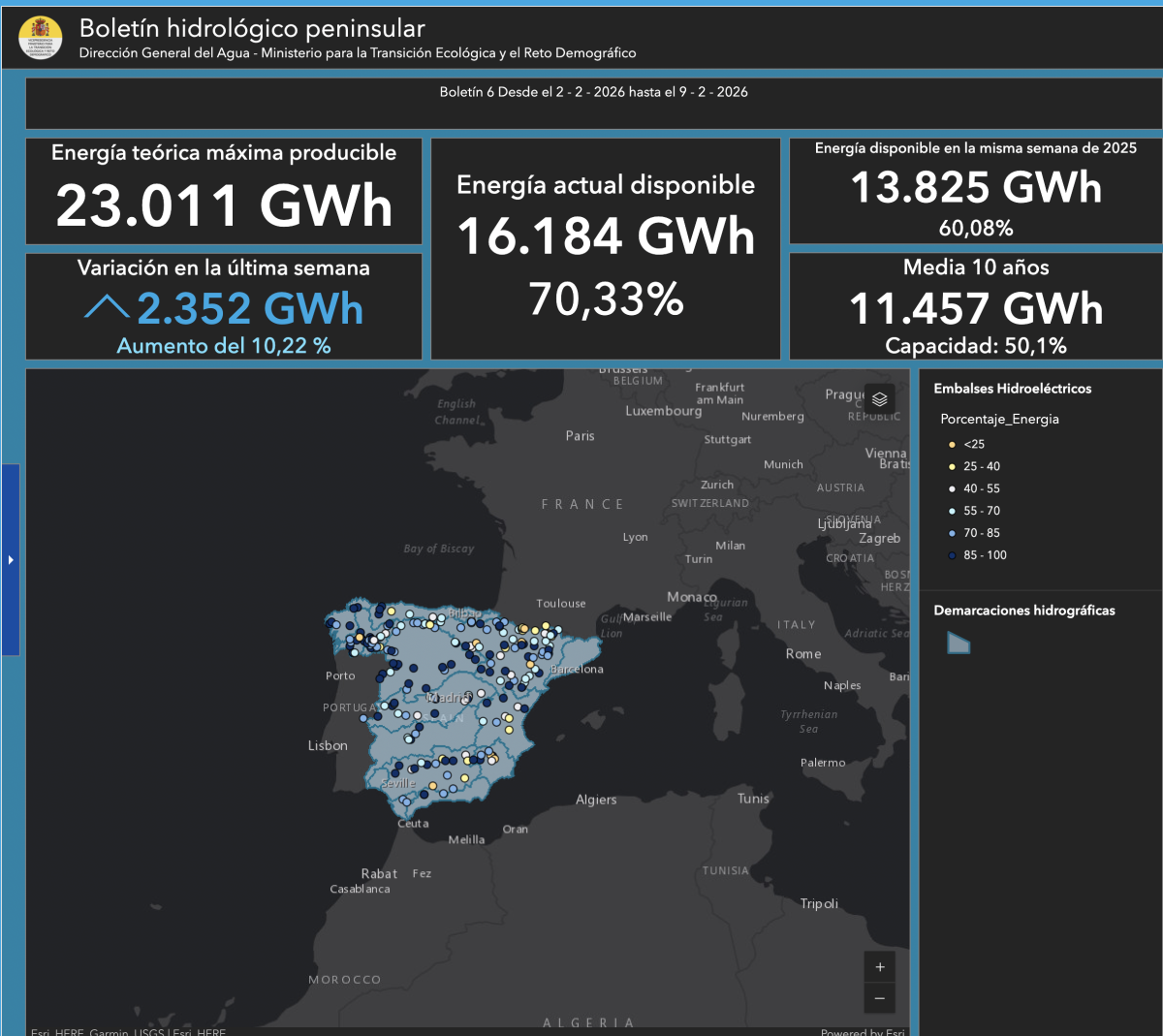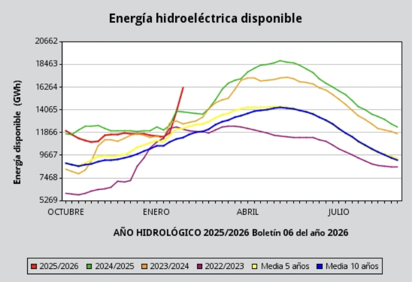 La producción hidroeléctrica desde el día primero del año actual hasta el 8 de febrero de 2026 ha sido de 5.208 GWh, que comparada con la del mismo período del año anterior que fue de 4.964 GWh, representa una diferencia de 244 GWh, que supone el 4,9 % respecto al año anterior.