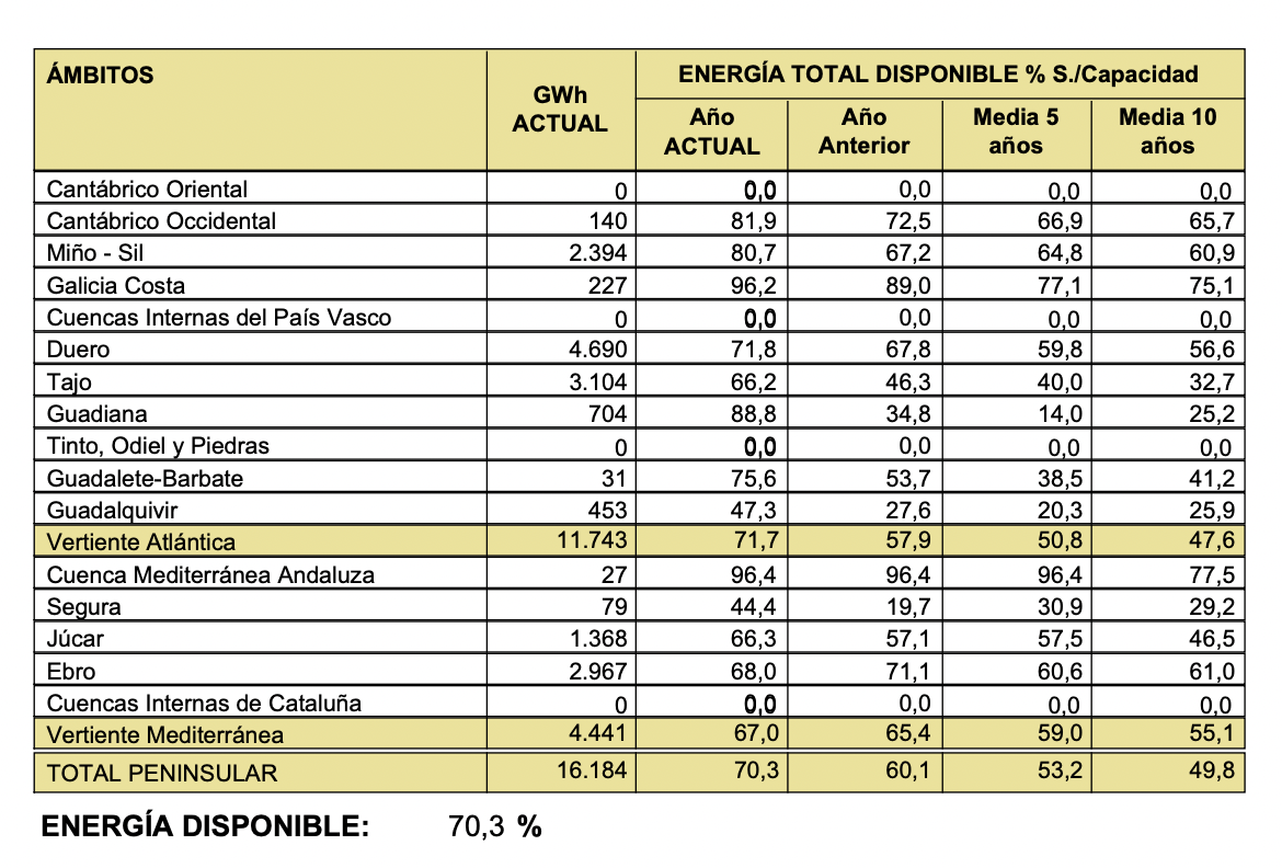 Según los datos publicados en el último Boletín Hidrológico que se dio a conocer este martes, la energía hidroeléctrica calculada, máxima teórica disponible, es actualmente de 16.184 GWh, 2.352 GWh más respecto al boletín anterior, que representa el 70,3 % de la capacidad total. Nunca se había dado una subida tan fuerte en sólo una semana.