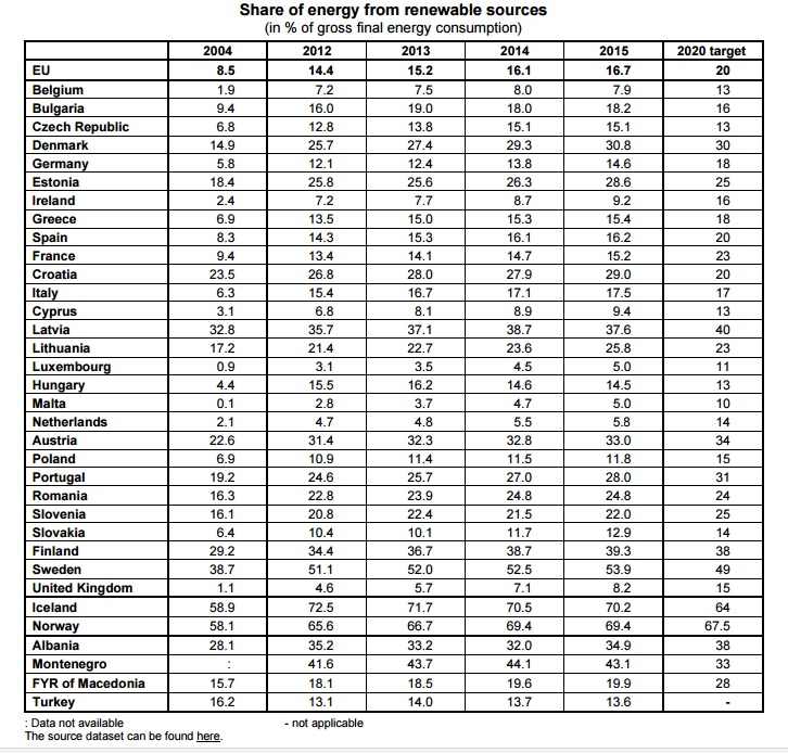 Desde 2004, la proporción de energías renovables sobre el consumo total ha crecido en todos los socios comunitarios y, comparado con 2014, veintidós de los veintiocho países registraron subidas en 2015.