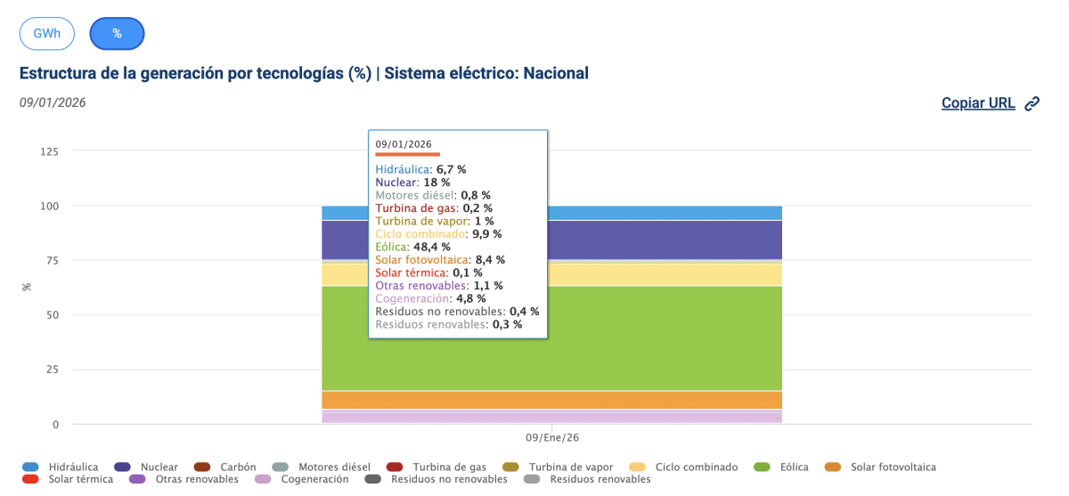 Ese mismo día 9, los 456 GWh de la eólica supusieron prácticamente la mitad de la generación eléctrica del día. La tecnología del viento alcanzó una cuota media superior al 48%.