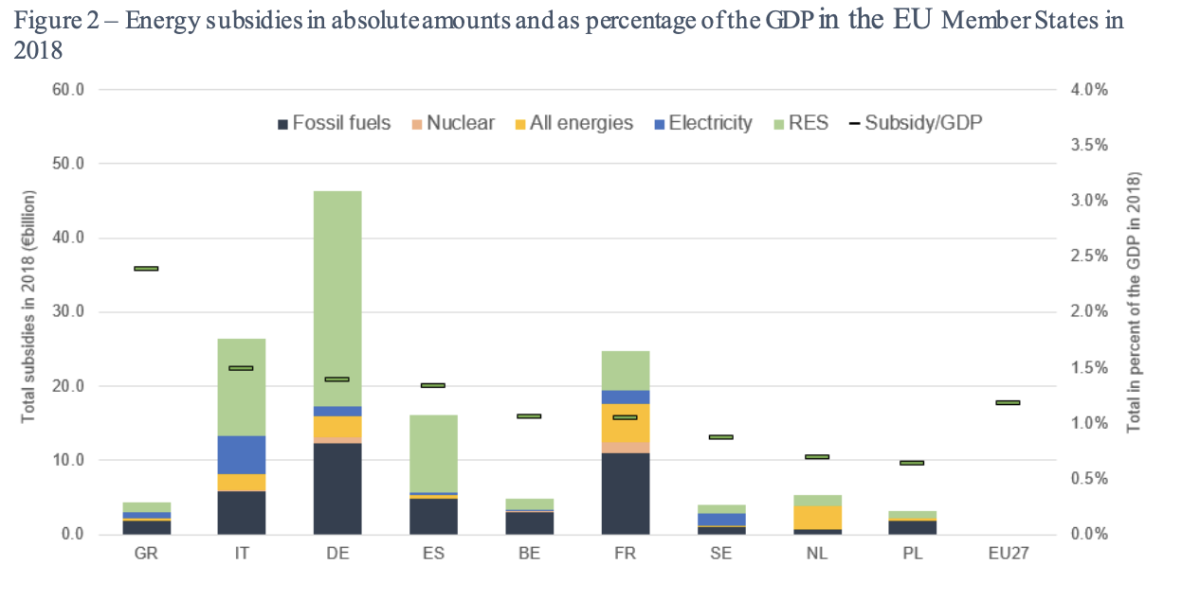 En el caso español, la cantidad de subsidios se sitúa sobre los 18.000 millones de euros, en su mayoría a las energías renovables que se pagan a través de la factura de la luz. Esta cifra la sitúa en la cuarta posición que más dinero destina a la energía solo por detrás de Alemania, Italia y Francia. Pero si se tiene en cuenta esta cifra con el PIB del país, España destina al sector energético el 1,5% del PIB, y sería el tercero entre las principales economías europeas por detrás de Italia y Alemania.