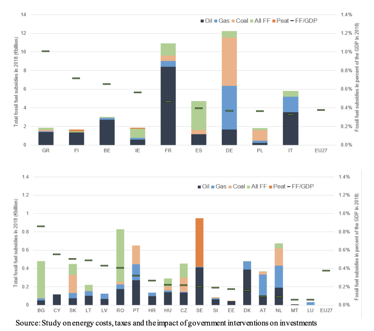 Es este capítulo, el de las ayudas a los combustibles fósiles una de las mayores preocupaciones para la Comisión Europea. Los 50.000 millones anuales son considerados una cifra muy alta. Para poner en contexto, las inversiones en nueva capacidad de generación de energía eólica ascendió a 16.000 millones de euros en 2018 en la UE, mientras que las inversiones en generación de energía solar fueron de alrededor de 8.000 millones de euros en el mismo período. Además las inversiones en redes eléctricas ascendieron a 31.000 millones. Es decir, que prácticamente se destina lo mismo a invertir en renovables y redes que a subvencionar los combustibles fósiles.