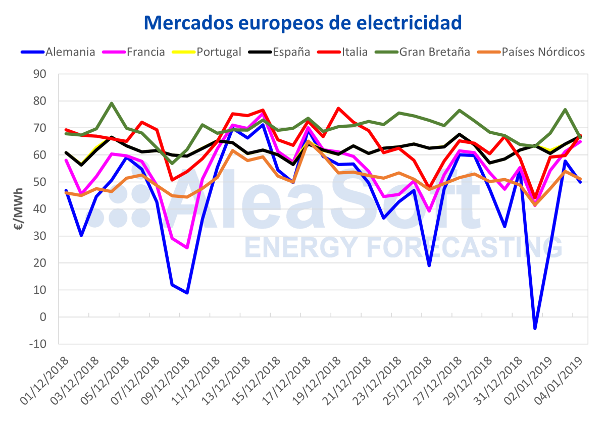 El resto de mercados europeos analizados por AleaSoftse han mantenido por debajo o alrededor de los 60 €/MWh durante estas fiestas.
