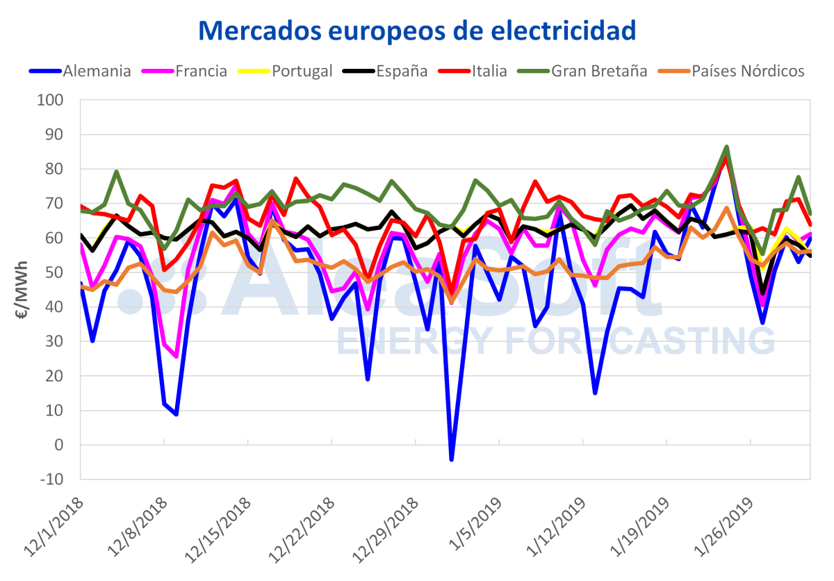 En general, durante esta semana que comenzó el 28 de enero, el precio de la mayoría de los mercados europeos ha rondado entre los 55 €/MWh y 60 €/MWh, excepto los mercados IPEX de Italia y N2EX de Gran Bretaña, que han estado entre los 65 €/MWh y 70 €/MWh.