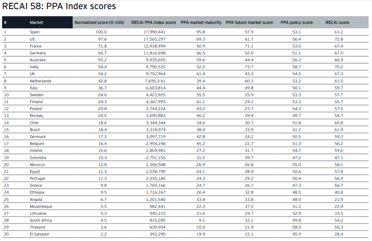 En la presente edición, el informe presenta un novedoso ranking mundial de PPA (ver a continuación) que lidera España por delante de Estados Unidos en una lucha apretada. EEUU comenzó la carrera de los PPAs varios años antes y seguía siendo el mercado más grande en 2020 pero desacelerando su ritmo de crecimiento, mientras en el caso español el mercado está en auge y EY espera que sea el más caliente en este y próximos años.