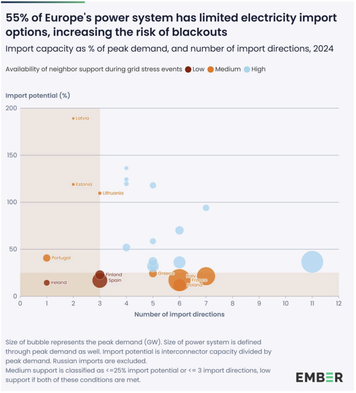 Dicho informe que a pesar de la confiabilidad de la red eléctrica europea, el 55% del sistema eléctrico europeo tiene opciones limitadas de importación de electricidad, y eso aumenta el riesgo de apagones. España, Irlanda y Finlandia están particularmente expuestos, con muy poco apoyo de sus vecinos en caso de incidentes en la red. (Ver gráfica)