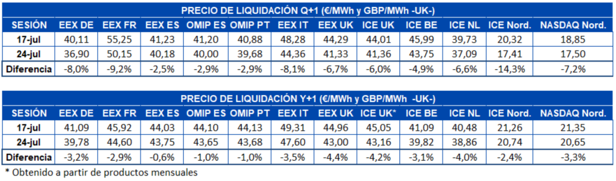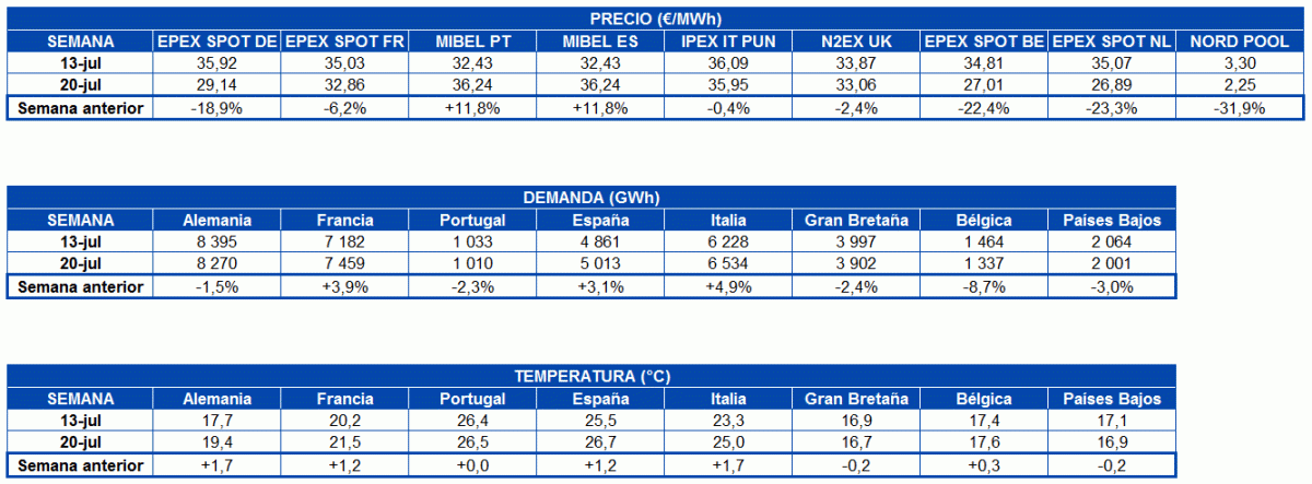 La semana del 20 de julio, los precios fueron inferiores a los de la semana del 13 de julio en la gran mayoría de los mercados eléctricos europeos analizados. La excepción fue el mercado MIBEL de España y Portugal, donde se registró un incremento del 12%. En cuanto a los descensos, el mercado con la mayor caída de precios, del 32%, fue el mercado Nord Pool de los países nórdicos, seguido por el mercado EPEX SPOT de los Países Bajos y el de Bélgica, con bajadas del 23% y 22% respectivamente. Mientras que el mercado donde los precios disminuyeron menos, un 0,4%, fue el mercadoIPEX de Italia. En el resto de los mercados, las bajadas de los precios estuvieron entre el 2,4% del mercado N2EX de Gran Bretaña y el 19% del mercado EPEX SPOT de Alemania.