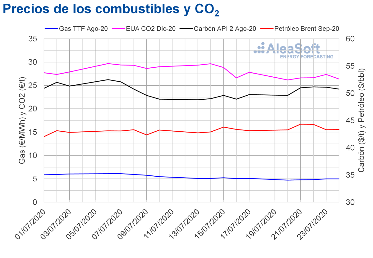 En cuanto a los futuros de derechos de emisión de CO~2~ en el mercado EEX para el contrato de referencia de diciembre de 2020, la cuarta semana de julio tuvieron precios de cierre inferiores a los de los mismos días de la tercera semana de julio y se mantuvieron por debajo de los 27 €/t. La excepción fue el jueves 23 de julio. Ese día se alcanzó un precio de cierre de 27,34 €/t, el cual fue un 2,7% superior al del jueves 16 de julio. Por otra parte, el lunes 20 de julio se registró el precio de cierre mínimo de la semana, de 26,18 €/t, un 11% inferior que el del lunes 13 de julio. No se registraba un precio de cierre tan bajo desde finales de junio.