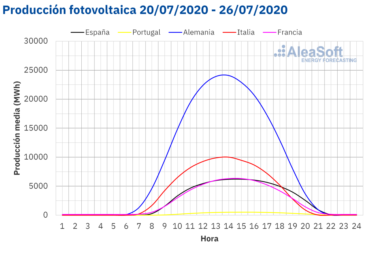 Durante los 26 primeros días de julio, la producción solar fue superior a la de los mismos días de julio de 2019 en todos los mercados europeos analizados. Los ascensos más notables fueron los de España y Portugal, con valores del 61% y 34% respectivamente. En el caso de Alemania, Francia e Italia, los incrementos fueron del 2,1%, 5,6% y 13% respectivamente.