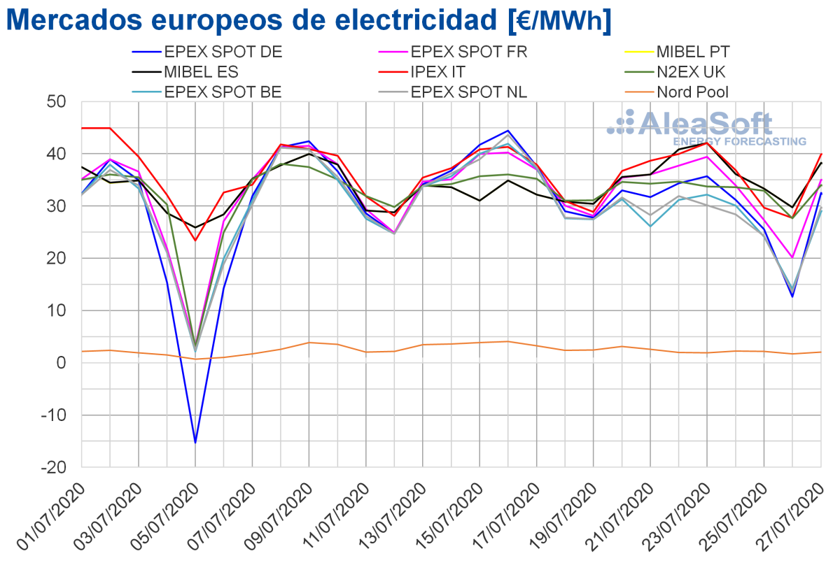 Los precios diarios más bajos de la cuarta semana de julio se alcanzaron en el mercado Nord Pool. Los precios en este mercado estuvieron entre los 3,13 €/MWh del lunes 20 de julio y los 1,72 €/MWh del domingo 26 de julio. Ese día también se alcanzaron precios diarios inferiores a 15 €/MWh en el mercado alemán y el mercado belga.