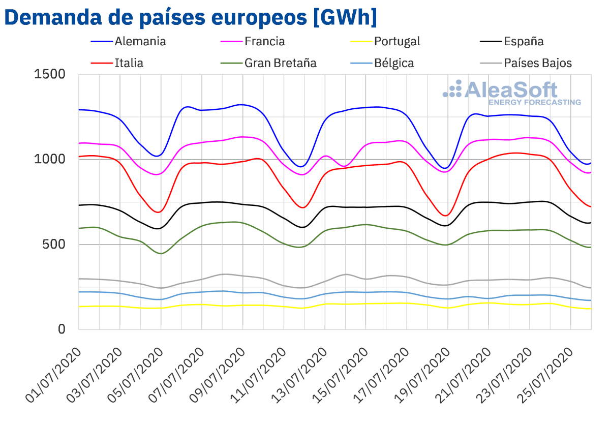 Las previsiones de demanda de AleaSoft indican que para la semana del 27 de julio la demanda caerá en gran parte de los mercados de Europa respecto a la semana del 20 de junio, mientras que en Francia y España volverá a ser superior.
