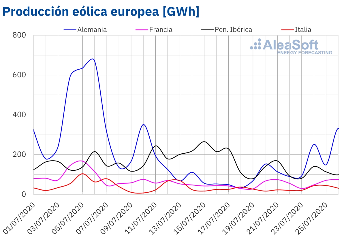 Del 1 al 26 de julio la producción registró aumentos, en términos interanuales, en la mayoría de los mercados europeos. Los mayores incrementos fueron en España, Francia y Portugal, con valores del 34%, 31% y 22% respectivamente. En Italia la subida fue del 3,8%, mientras que en Alemania la producción eólica disminuyó un 2,0%.