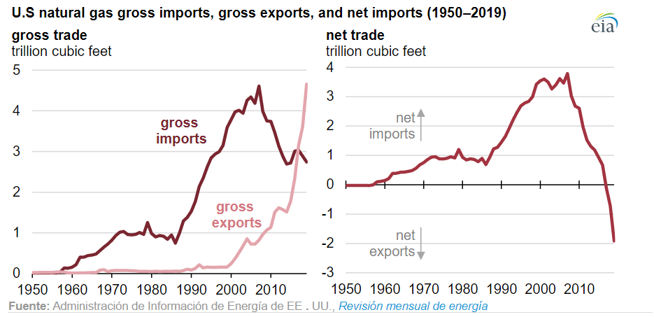 A medida que la producción de gas natural aumentó en Estados Unidos, las exportaciones de gas natural también aumentaron, superando las importaciones de gas natural en 2017 por primera vez desde 1957. En 2019, EEUU exportó un récord de casi 5 Tcf de gas natural, principalmente por oleoducto a México y Canadá o enviado al extranjero como gas natural licuado (GNL). Las importaciones de gas natural en 2019 fueron inferiores a 3 Tcf, el nivel más bajo desde 2015. La mayoría de las importaciones de gas natural de EEUU proceden de Canadá.
