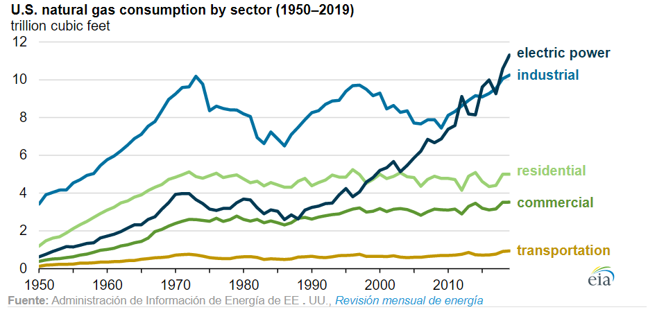 El sector eléctrico de EEUU ha sido el mayor usuario final de gas natural en cuatro de los últimos cinco años, después de superar por primera vez al sector industrial en 2012. El gas natural ha sido la fuente predominante de generación eléctrica en Estados Unidos desde que superó al carbón en 2016. El consumo de gas natural en Estados Unidos se divide casi por igual entre el sector eléctrico (36% del consumo total de gas natural en 2019); el sector industrial (33%); y los sectores residencial, comercial y de transporte (31% combinado).