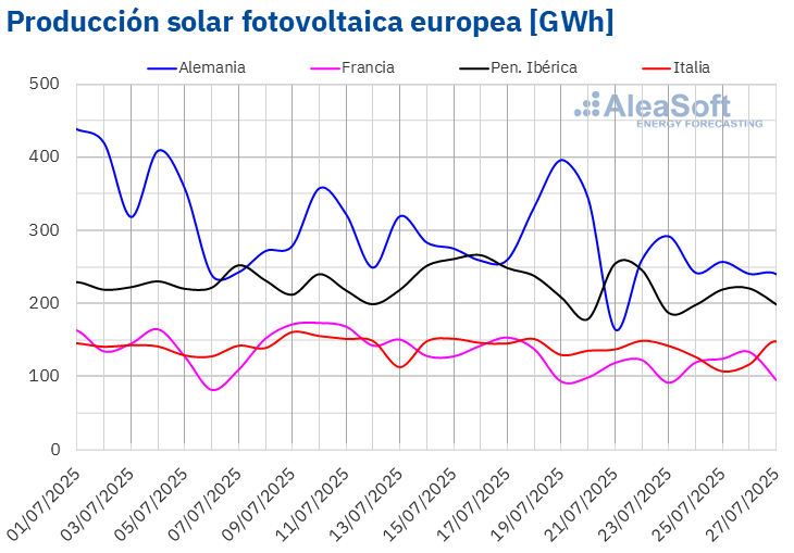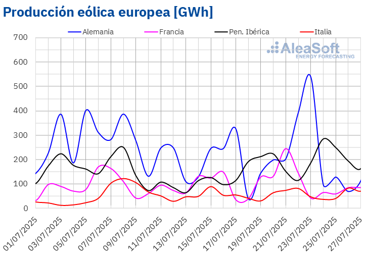 A pesar de la bajada registrada en el mercado francés, el 21 de julio el mercado presentó un récord histórico de generación diaria de energía eólica para un mes de julio, con 245 GWh. Además, el 24 de julio, el mercado español alcanzó una producción eólica diaria de 228 GWh, un valor no observado desde mediados de abril.