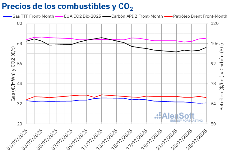 En cuanto a los futuros de gas TTF en el mercado ICE para el Front‑Month, registraron su precio máximo semanal, de 33,16 €/MWh, el lunes 21 de julio. A partir de entonces, los precios descendieron de forma progresiva, salvo el viernes 25 de julio, cuando aumentaron un 0,4% respecto al día anterior. El jueves 24 de julio, los futuros alcanzaron su precio mínimo semanal, de 32,36 €/MWh. El viernes 25 de julio, los futuros alcanzaron el precio de 32,50 €/MWh, un 3,3% inferior al del viernes anterior, según datos de AleaSoft Energy Forecasting. El precio promedio semanal disminuyó con respecto a la semana anterior, con una bajada del 5,1%.
