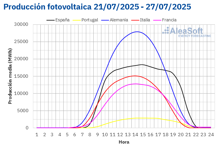 Para la semana del 28 de julio, según las previsiones de producción solar de AleaSoft Energy Forecasting, la producción solar fotovoltaica aumentará en los mercados alemán y español. En el mercado italiano, la producción solar continuará disminuyendo.