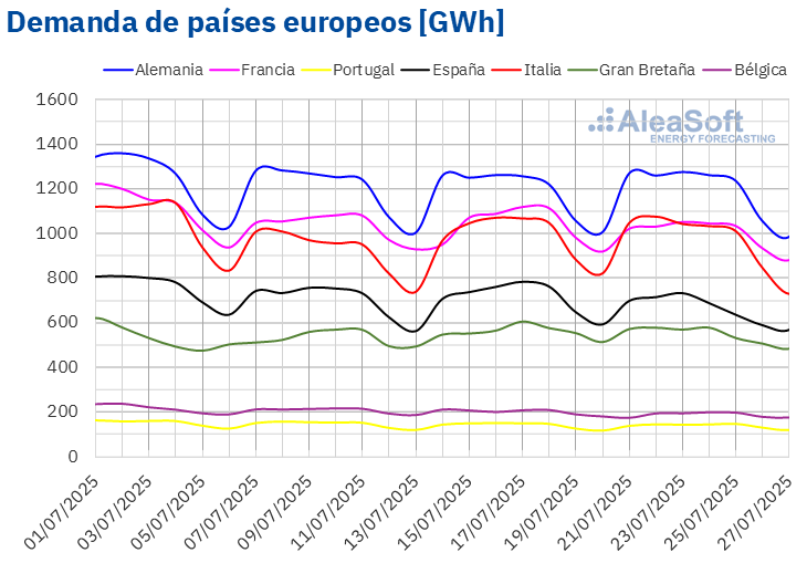 Para la semana del 28 de julio, según las previsiones de demanda de AleaSoft Energy Forecasting la demanda aumentará en los mercados belga, español, francés y portugués. En cambio, anticipa una disminución en los mercados italiano, alemán y británico.