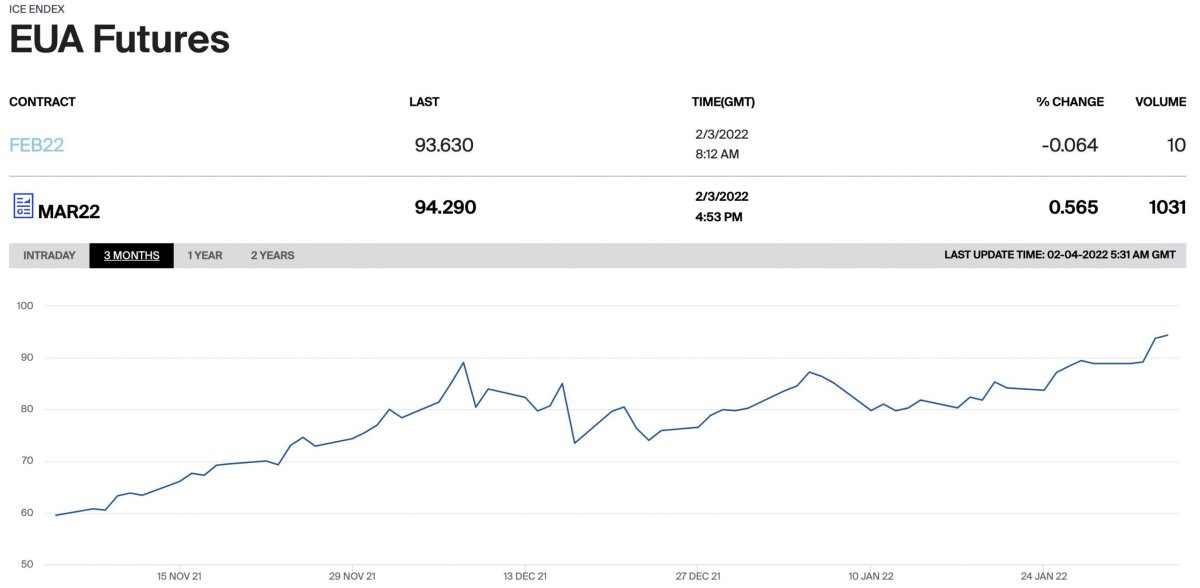 Tal y como se puede ver en la gráfica, el precio del carbono ha pasado de 60 €/t a 94 euros en tan solo tres meses.